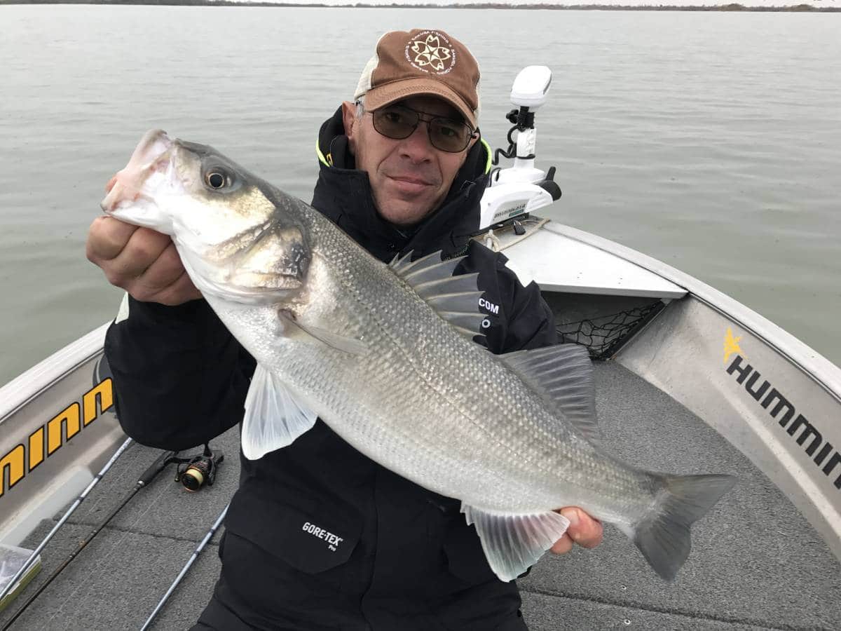 Les conditions sont vraiment « limites » pour notre bateau, nous décidons de rentrer un peu dans le Rhône afin d’être moins secoués, après avoir essayé plusieurs zones sans résultat, nous prospectons un haut fond et commençons à enregistrer quelques touches, fish ! …… Premier Loup correct pour moi, puis un second. Papa pique lui aussi un loup correct, nous nous livrons à une petite battle amicale..
