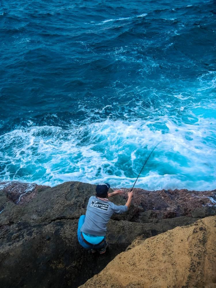Niveau matériel, j’avais emmené une Shinjin Neo 704M en spinning et, ne savant pas vraiment à quoi m’attendre, j’avais surtout misé sur une pêche au casting jig qui permet souvent de prendre de tout un peu partout. J’avais aussi emporté quelques poissons nageurs (Reefsand Minnow, Phoxy Minnow HW …) et une boîte de leurres souples déjà montés et sans paquet de secours. Les conditions de pêche m’ont rapidement orienté vers une pêche aux leurres souples, notamment au shad pour la simple raison que je me trouvais toujours à quelques mètres au dessus du niveau de la mer pour me protéger des vagues. Dans ces cas là, pêcher au poisson nageur et au jig dans la mousse à trois mètres au dessus de l’eau est inefficace.