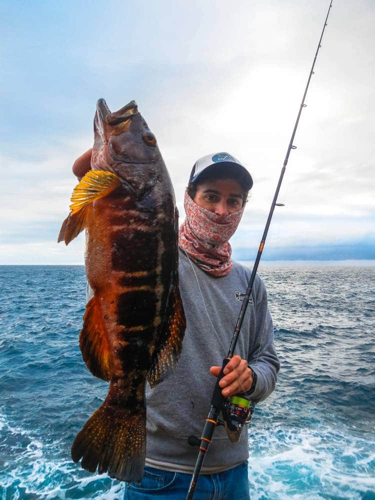 Puis, en pêchant la mousse au shad (L16 Shad Baby et Slit shad 3″) sur des spots profonds en bas des falaises, nous avons trouvé des poissons plus intéressants comme des gros garoupas, des sars et des bicudas (bécune à bouche jaune), dont un correct estimé à 80 cm. D’ailleurs, celui-ci m’aura valu une bonne douche dans le ressac au moment de le sortir : un peu plus et je finissais au fond de l’eau…