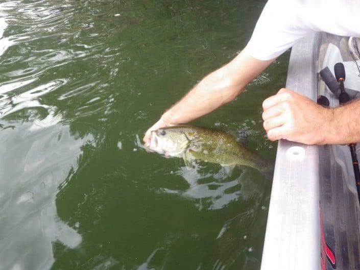 Les brochets ne sont pas actifs, on va donc insister sur des spots à bass en texan à l’aide de Baby Craw Gary Yamamoto en 3,5 g. C’est depuis des années la meilleure écrevisse pour les pêches finesse. Grâce à elle,  je rentre plusieurs bass, mais non maillés de peu !