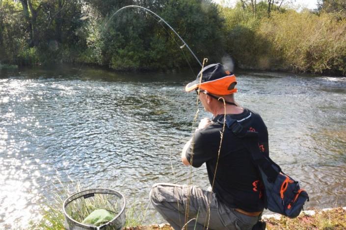 Je démarre avec le nouveau Phoxy Minnows HW en Real Life Vairon. Les premières traversées du courant sont sanctionnées par de grosses touches dont les traces sur le leurre ne laissent aucun doute quant à l’identité de l’agresseur ! Il s’agit bien de truites ! Mais les hameçons simples ne facilitent pas la prise de ces cabris des courants. Il est temps pour moi de changer de leurre, j’en profite pour expliquer à Darren où les poissons sont postés. Au premier lancer, il met les choses en pratique et capture une, puis deux …. Le compteur s’emballe et tout le monde y va de bon cœur !