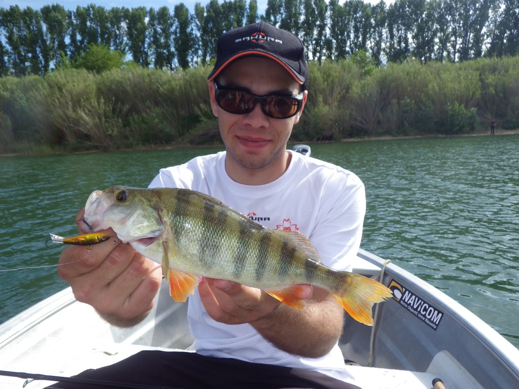 Le vent qui s’est levé ne facilite pas la prospection, mais nous continuons à prendre quelques perchettes par ci par là. Je décroche au bateau un brochet de 75 cm environ, toujours avec mon imitation perche soleil et Tristan terminera la journée avec un brocheton.